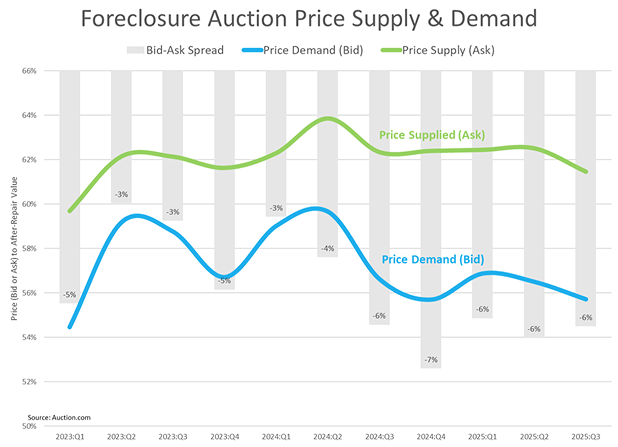 Sellers lowered pricing at both foreclosure and REO auctions in Q3 2025. The average credit bid-to-after-repair value at foreclosure auction fell 105 basis points from Q2 and 88 basis points from a year ago.