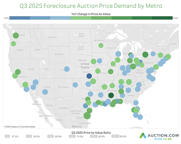 Foreclosure auction buyers were willing to pay an average of 55.7 percent of estimated after-repair value in Q3 2025, down slightly from 56.5 percent in Q2 and 56.6 percent a year ago. Price demand ticked up to 55.9 percent in September, suggesting a tentative floor.