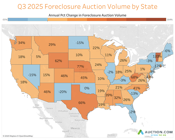 Auction.com’s Q3 2025 marketplace data reveals a continued rise in distressed property supply, particularly at foreclosure auction, even as buyer engagement and pricing behavior softened. The increase in completed foreclosure auctions — up 31 percent year-over-year — signals a more active pipeline, driven by lower equity levels, and the expiration of foreclosure moratoriums on VA-insured loans. However, buyer caution remains evident, with declining sales rates and subdued bidder activity suggesting ongoing market hesitancy.