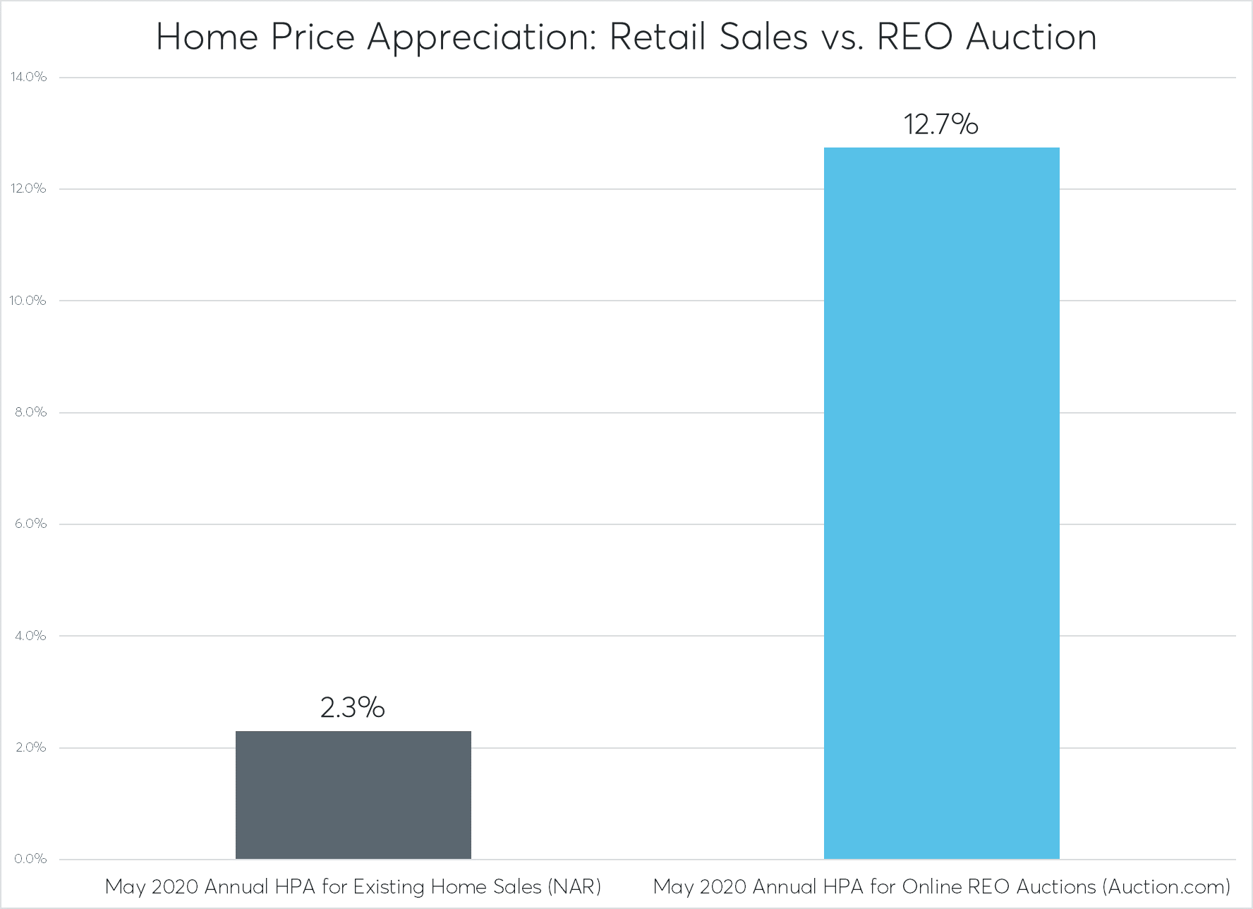The share of online REO auction properties with competing bidders rose in the wake of the pandemic-induced economic crisis — similar to the trend in the retail market — but buyer competition at online auction has been much less volatile than the retail market over time. The share of multiple offers in the retail market, as measured by Redfin, dropped to a 10-year low of 9 percent in December 2019. That same month, 75 percent of REOs sold on the Auction.com platform had multiple, competing bidders.
