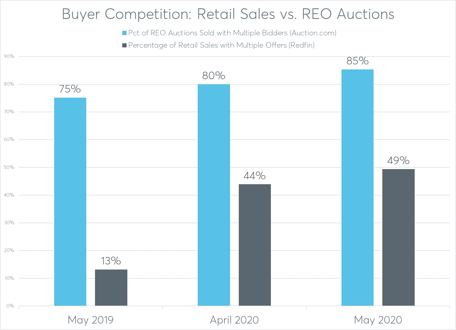 But even in this frenzied market, the share of retail homes with multiple offers is dwarfed by the share of multiple bidders for distressed homes sold via online auction. Proprietary data from Auction.com shows 85 percent of all bank-owned (REO) homes sold in May received bids from multiple, unique bidders — well above the retail share of 49 percent.
