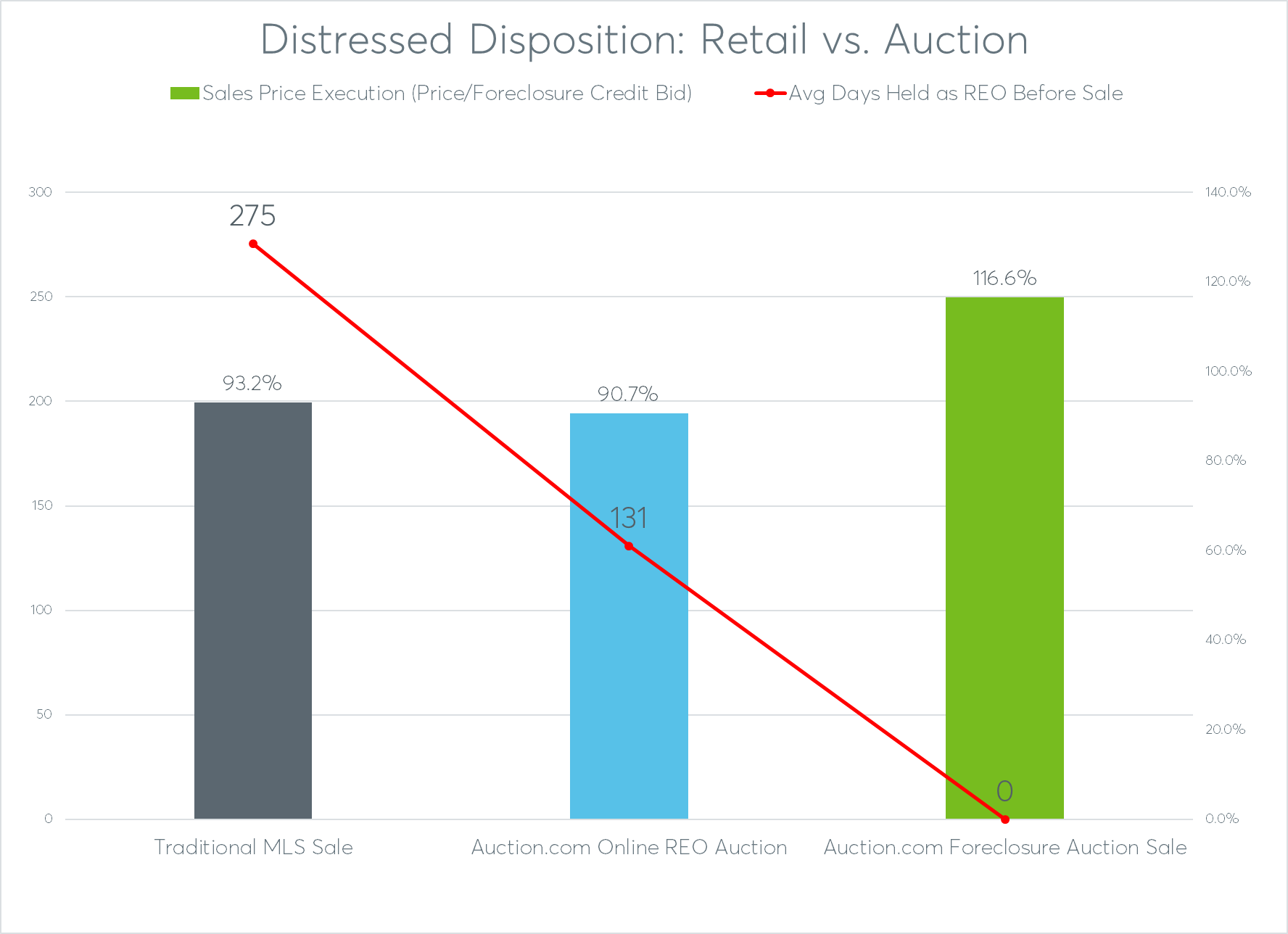 Even without factoring in holding and resale costs, the Auction.com analysis found that distressed homes sold to third-party buyers at foreclosure auction performed better in terms of price execution relative to the seller’s credit bid at the foreclosure auction. Those third-party foreclosure sales sold for an average of 116.6 percent of the seller’s credit bid, while homes that reverted to REO and then resold on the MLS (275 days later) sold for an average of 93.2 percent of the seller’s credit bid set back at the foreclosure auction — without accounting for any costs associated with holding and selling the homes.