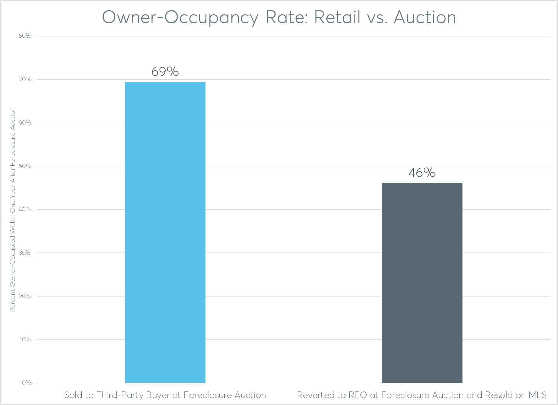 An Auction.com analysis of more than 165,000 properties brought to foreclosure auction in 2018 and 2019 found that REO properties resold on the MLS were less likely to be owner-occupied a year after the foreclosure auction than properties that sold to third-party buyers at the foreclosure auction. According to the analysis, 69 percent of properties sold to third-party buyers at the foreclosure auction (typically cash-buying investors) were owner-occupied within a year, compared to a 46 percent owner-occupancy rate for properties that reverted to REO at the foreclosure auction and then were subsequently resold on the MLS.