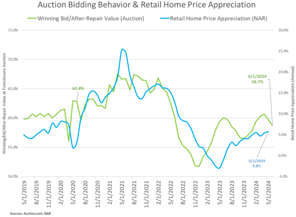 If it continues past June, the demand slippage from buyers like Tritt could also foreshadow a slowdown in retail home price appreciation. Because buyers at distressed market auctions are anticipating retail market conditions three to six months into the future, bidding behavior at those auctions provides a reliable forward-looking indicator of trends in retail home price appreciation.