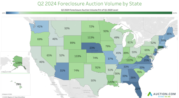 The number of properties brought to foreclosure auction in the second quarter was less than half (46 percent) of the pre-pandemic level in Q1 2020. That was down from 49 percent in the previous quarter and down from 57 percent in the second quarter of 2023.