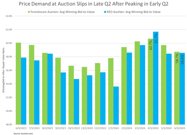 A similar pattern of June demand slipping from a nearly two-year high earlier in the quarter shows up in demand metrics related to pricing — both for foreclosure auctions and REO auctions.