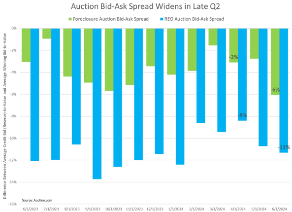 The bid-ask spread between what bidders were willing to pay and what sellers were willing to take for distressed properties at auction stayed relatively flat in the second quarter overall compared to the previous quarter and a year ago, but the bid-ask spread widened noticeably in June as the price demanded by buyers downshifted without a corresponding downshift in pricing by sellers.
