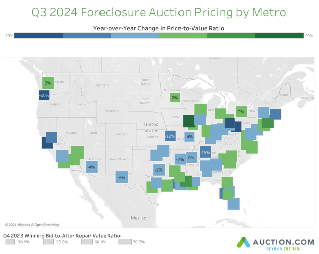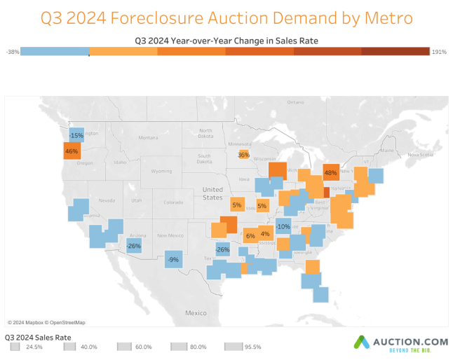 Although there was a broad-based decrease in foreclosure auction demand at the national level, more than four in 10 markets bucked the national trend, according to an analysis of the top 65 metropolitan statistical areas in terms of volume of foreclosure auctions in Q3 2024.
