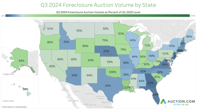 The number of properties brought to foreclosure auction in the third quarter was at 44 percent of the pre-pandemic level in the first quarter of 2020, down from 46 percent in the previous quarter and down from 53 percent in Q3 2023 to the lowest level since Q3 2021, when the pandemic-triggered nationwide foreclosure moratorium on government-insured mortgages was still in effect.