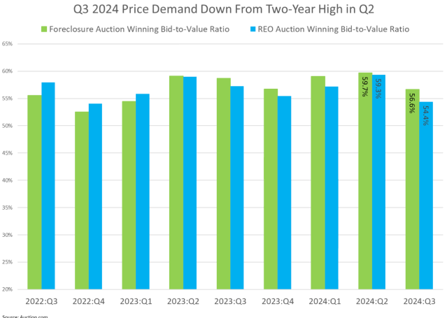 The widening bid-ask spreads came despite lower pricing by sellers in the third quarter compared to the second quarter. The average reserve-to-value ratio for REO auctions was down 1 point on a quarterly and annual basis, and the average credit bid-to-value ratio for foreclosure auctions was down 2 points on a quarterly basis, although it was unchanged from a year ago. But those decreases in seller pricing lagged the more significant decreases in what buyers were willing to pay in the third quarter.