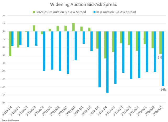 The bid-ask spread between what bidders were willing to pay and what sellers were willing to take for distressed properties at auction widened in the third quarter of 2024, both for foreclosure auctions and REO auctions.