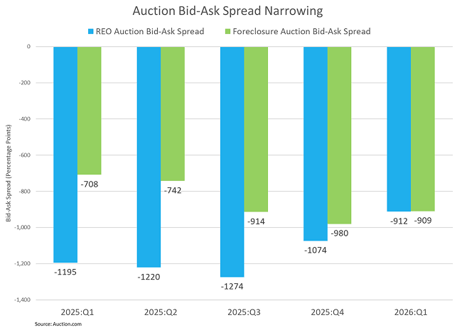 - Bid-ask spreads narrowed quarter-over-quarter at both auction types. The REO auction bid-ask spread narrowed to approximately 912 basis points as sellers adjusted pricing lower compared to a year ago, and foreclosure auction bid-ask spread narrowed to approximately 909 basis points despite seller pricing rising from a year ago.