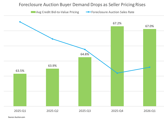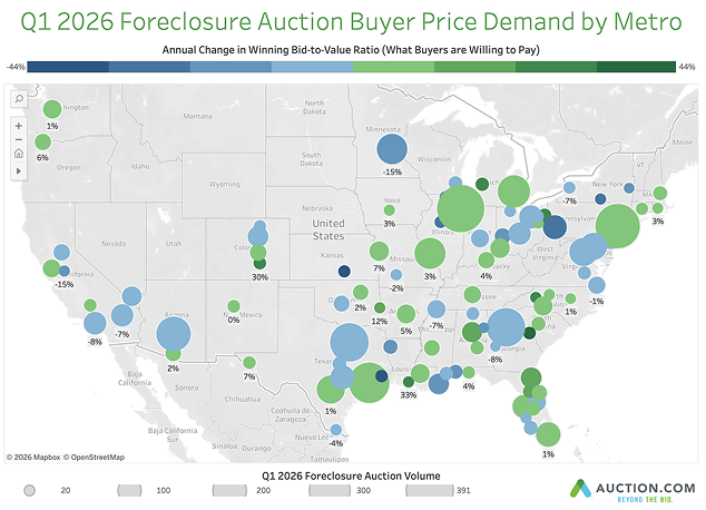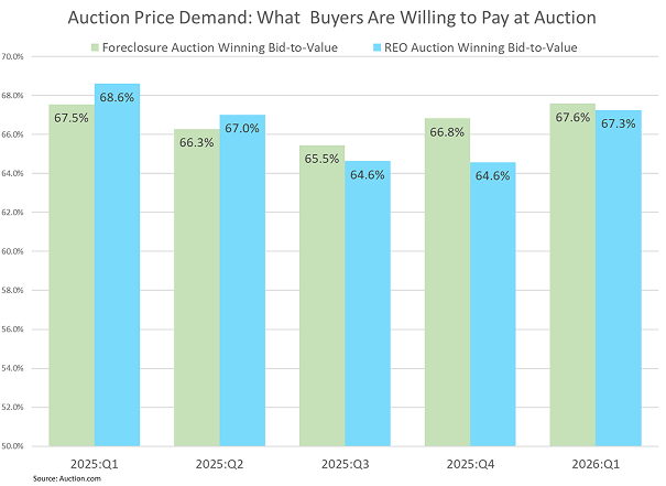 - Buyer price demand moved higher from the previous quarter at both foreclosure and REO auction. Foreclosure auction buyers were willing to pay 67.6 percent of estimated retail market value in Q1 2026, while REO auction buyers were willing to pay 67.3 percent.