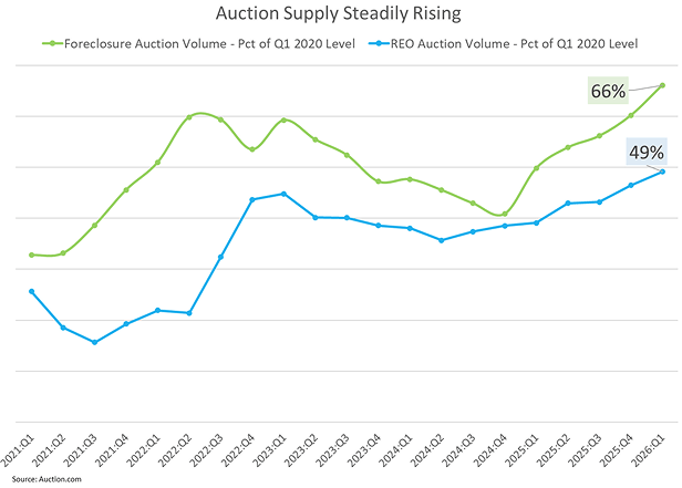 Distressed supply continued to rebuild in Q1 2026. Completed foreclosure auctions increased to 66 percent of their Q1 2020 level, up approximately 10 percent from Q4 2025 and 33 percent from a year ago, continuing the gradual normalization in foreclosure resolution activity. Scheduled foreclosure auctions rose to approximately 69 percent of their Q1 2020 level, up 11 percent quarter-over-quarter and 16 percent year-over-year, indicating additional supply is likely to flow through the auction pipeline in coming quarters.
