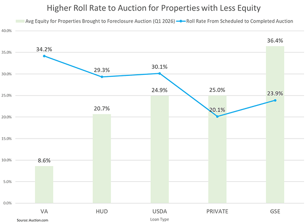 - Average equity for scheduled foreclosure auctions declined to 26.9 percent of value, down 6 percent quarter-over-quarter and 13 percent year-over-year, putting more upward pressure on the roll rate from scheduled to completed foreclosure auction.