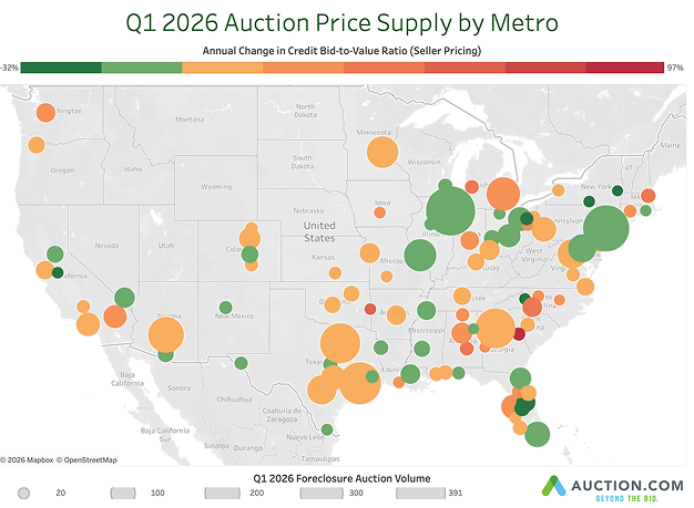 - Real Estate Owned (REO) auction volume reached 49 percent of its Q1 2020 level, up 6 percent from the previous quarter and 26 percent from Q1 2025.