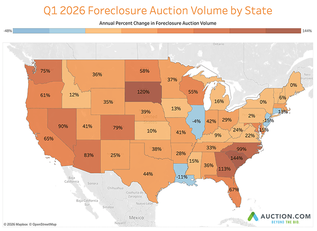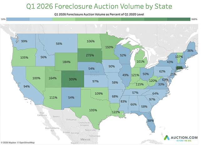 - Completed foreclosure auctions reached 66 percent of their Q1 2020 level in Q1 2026, up approximately 10 percent from Q4 2025 and 33 percent from a year ago.