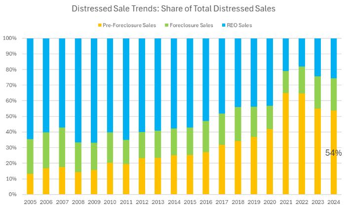 That increase in pre-foreclosure sales during the foreclosure moratorium occurred even while other distressed sales — foreclosure auction sales and bank-owned (REO) sales — were decreasing. That combination resulted in pre-foreclosure sales accounting for a record-high 65 percent of all distressed sales in 2021 and 2022. Pre-foreclosure sales accounted for 55 percent of all distressed sales in 2023 and are on track to hit 54 percent of all distressed sales in 2024 — still well above the average of 28 percent between 2012 and 2019.