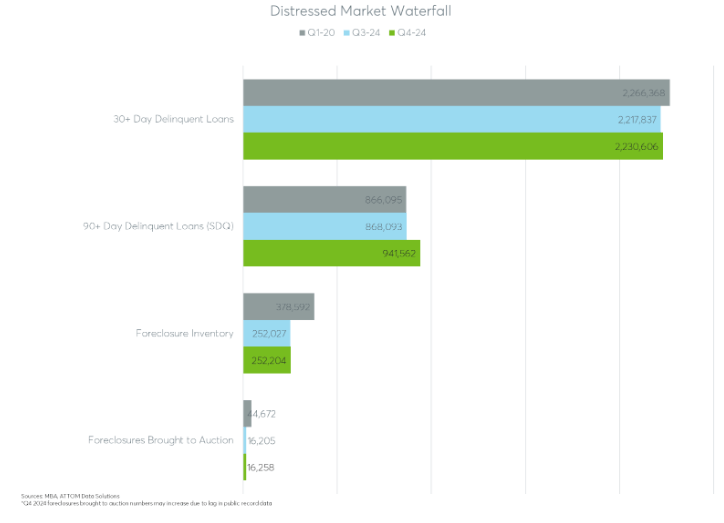 Foreclosure is looming for more homeowners in early 2025 with the inventory of seriously delinquent mortgages (those 90 days or more delinquent or in foreclosure) rebounding to above pre-pandemic levels in late 2024, according to an Auction.com analysis of the Q4 2024 National Delinquency Survey published by the Mortgage Bankers Association (MBA).