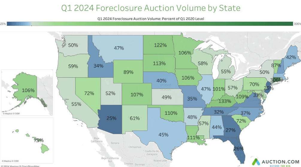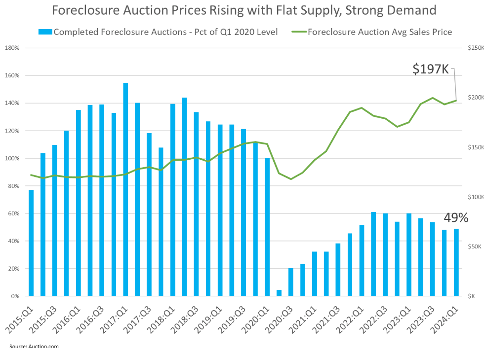 The number of properties brought to foreclosure auction on the Auction.com platform in Q1 2024 was at 49 percent of the Q1 2020 level, up slightly from 48 percent in the previous quarter but down from 60 percent in the first quarter of 2023.