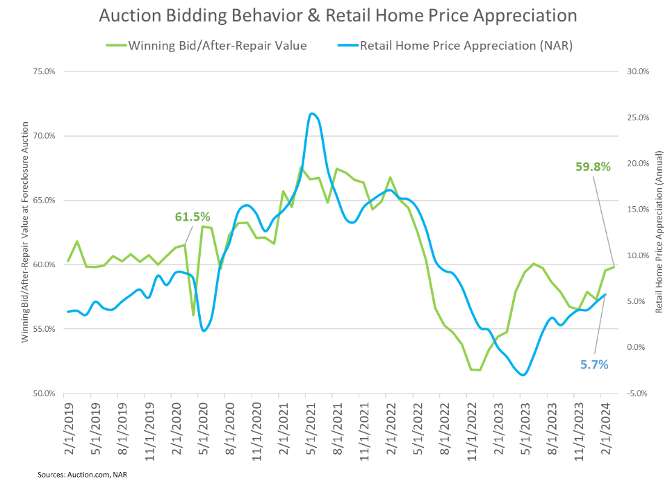 Bidding behavior on the Auction.com marketplace anticipated the rapid rebound in retail home price appreciation following the pandemic, and it anticipated the floor in retail home price appreciation in early 2023.