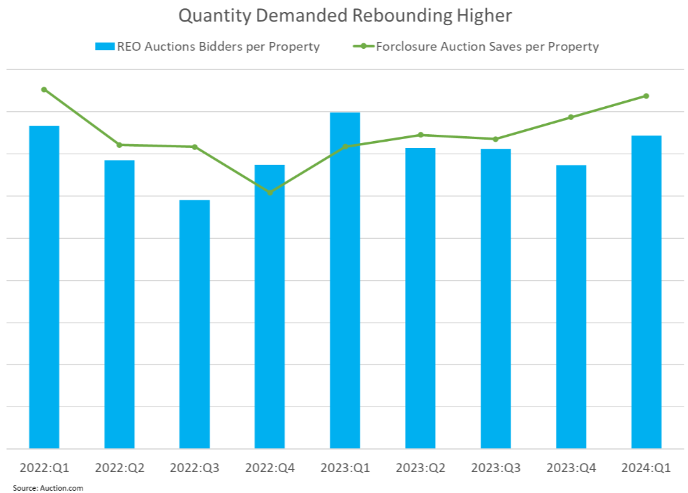 An increase in the average number of online saves by prospective buyers and bidders per property brought to auction both point to an increase in quantity demanded from potential buyers at distressed property auctions.