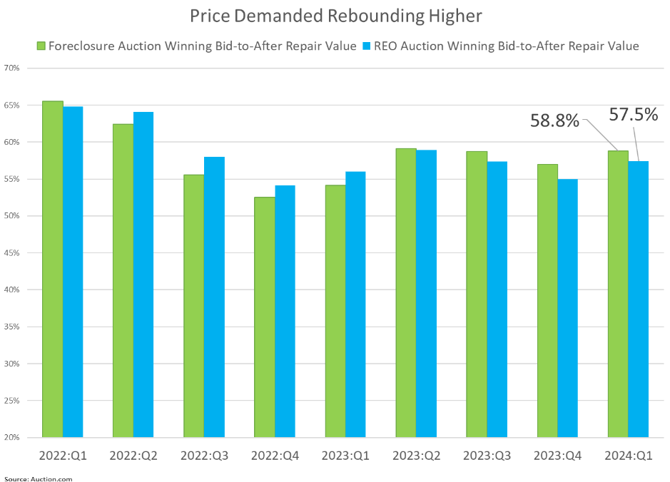 A rebound in the average price buyers were willing to pay relative to estimated after-repair value in the first quarter — both for in-person foreclosure auctions and online REO auctions — indicates that buyers have become more confident in the strength of retail home price appreciation in the second half of 2024. After-repair value is the estimated value of a property in fully repaired, or renovated, condition.