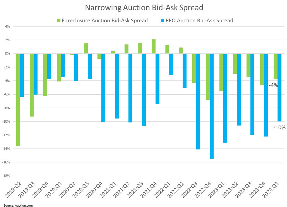 The bid-ask spread for foreclosure auctions was 4 percentage points in the first quarter, down from 5 points in the previous quarter and down from 6 points in the first quarter of 2023. The bid-ask spread for online REO auctions was 10 percentage points in the first quarter, down from 12 points in the previous quarter and down from 13 points in the first quarter of 2023.