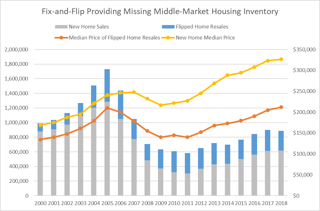 Furthermore, flipped homes were resold at a median price point of $212,000 in 2018 — more than $114,000 below the $326,400 median sales price for new homes sold in 2018, according to the Census bureau. That’s $114,000 closer to that elusive middle market the Harvard study argues is in short supply.