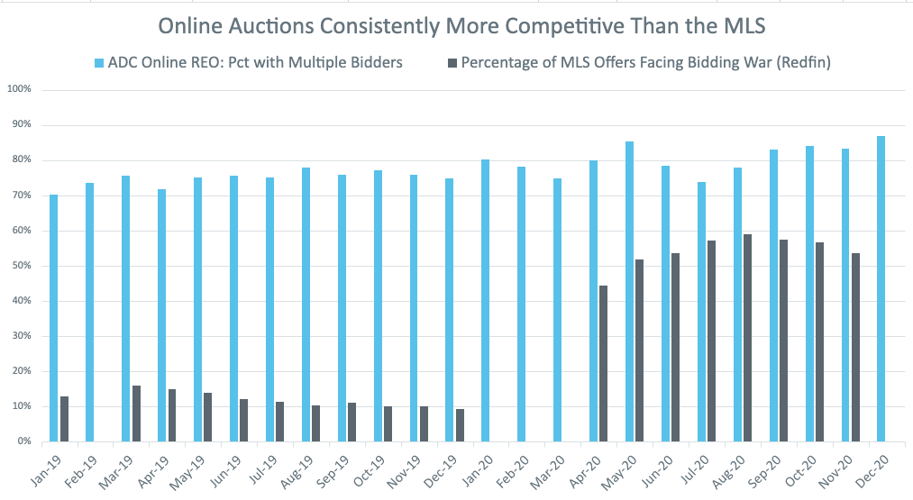 MVP allows the highest and best offer for pre-foreclosure properties, because Auction.com’s consistently competitive marketplace is transparent and low-friction. Let’s compare. Over the past two years, on average, 77 percent of properties sold via online auction on Auction.com have received bids from multiple, competing bidders. Over the same period, the average percentage of MLS properties with bidding wars has been 30 percent, according to data from Redfin.