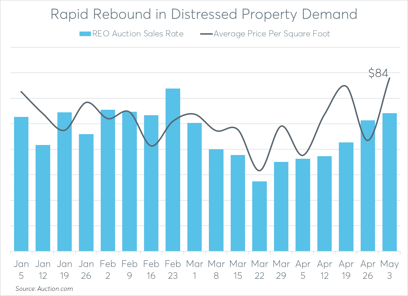 Demand from distressed property buyers quickly rebounded in April after dipping in late March immediately following the pandemic and national emergency declarations, according to proprietary data from the Auction.com online marketplace.