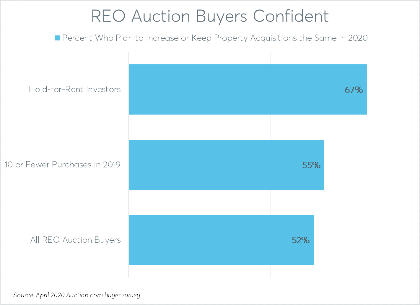 Smaller-volume REO auction buyers were more likely to express confidence in the post-crisis market, with 55 percent of those who purchased 10 or fewer properties in 2019 saying they planned to increase or keep their property acquisitions the same in 2020. Hold-for-rent investors purchasing via online REO auction were even more confident, with 67 percent saying they planned to increase or keep property acquisitions the same in 2020.