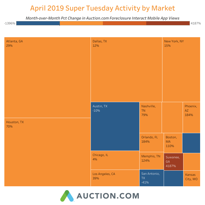 Views on the app’s Foreclosure Interact feature on April’s Super Tuesday (April 2) increased 15 percent nationwide compared to the previous month’s Super Tuesday (March 5), to the highest single-day total since the app was launched in September 2018. Not surprisingly, this trend occurred in states with a Super Tuesday foreclosure auction event: views for users located in Texas increased 15 percent from the previous month while screen views for users located in Georgia increased 26 percent.