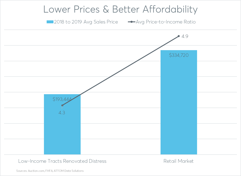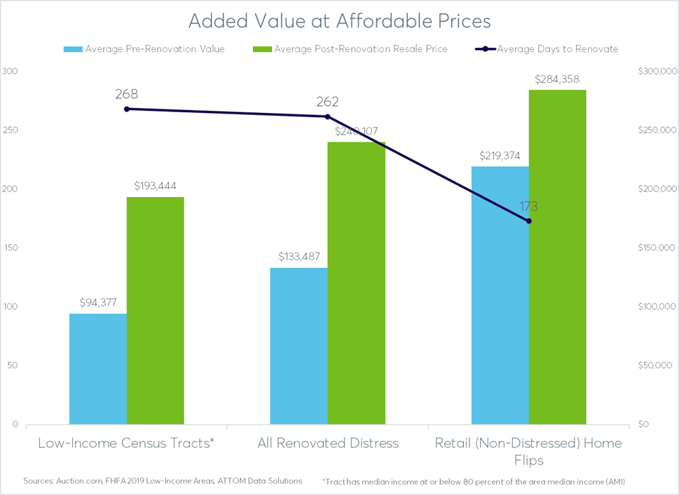 The average resale price for renovated distress was below $200,000 in low-income neighborhoods, which accounted for 30 percent of all homes renovated and resold after being purchased on the Auction.com platform over the past three years.