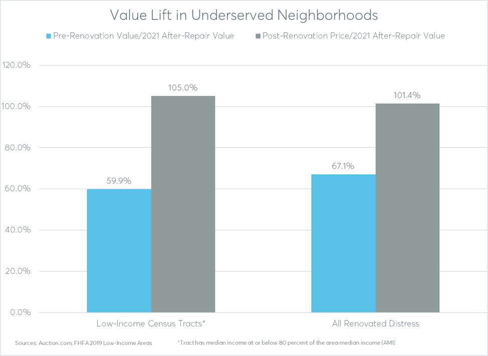 Distressed property renovators still added value in the low-income neighborhoods, selling at a price point that was 105 percent of the estimated 2021 after-repair market value on average. That represented a 45 percentage-point gain in value from the average 60 percent of after-repair value at purchase.