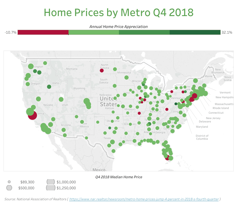 Median home sale prices decreased from a year ago in 15 of 178 metropolitan statistical areas included in the NAR report (8 percent). That alone is not abnormal — in Q3 2018 median home prices dropped annually in 12 of the 178 metro areas, and in Q4 2017 median home prices dropped annually in 16 of the 178 metro areas.