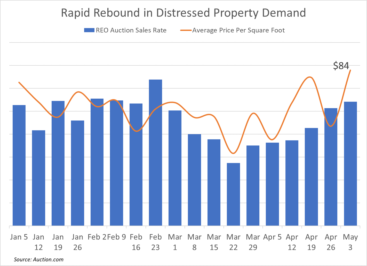 Real estate investor demand has also picked up after slowing down in late March, with the sales rate for online auctions of bank-owned (REO) property rising for six consecutive weeks to a 10-week high in the week starting May 3, according to proprietary Auction.com marketplace data. The average price per square foot for REOs sold via online auction hit a new year-to-date high of $86 that same week.