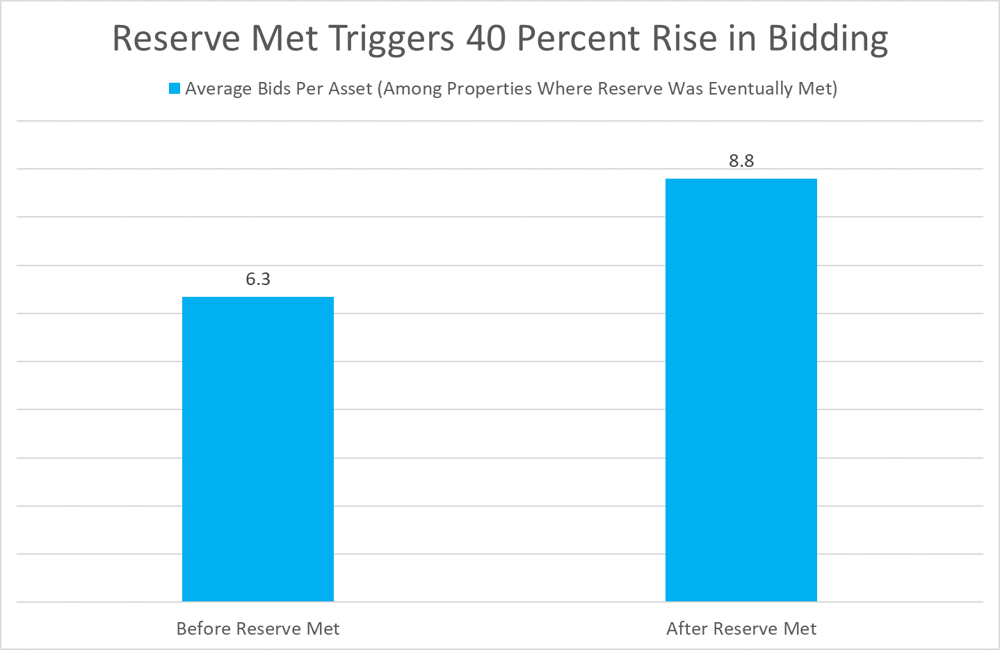 These reserve-met properties attracted more bidding competition thanks, in part, to a significant uptick in bidding once bidders became aware that reserve was met. Among properties where reserve was eventually met, the average number of bids increased by 40 percent after reserve was met (8.8 bids) compared to before reserve met (6.3 bids).