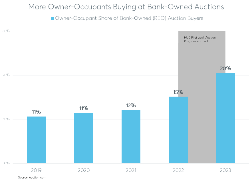 A survey of more than 400 Auction.com buyers in January 2024 found that 13 percent of respondents described themselves as owner-occupant buyers, down slightly from 15 percent in a 2023 survey but up from just 8 percent in a 2022 survey.