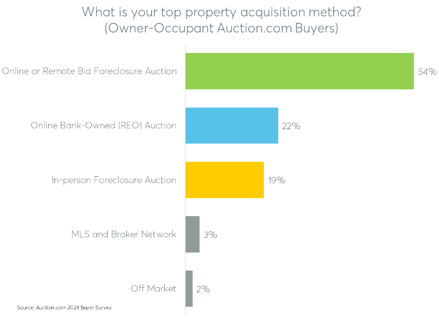 Among owner-occupant buyers who responded to the 2024 Auction.com survey, 76 percent ranked either online auctions or Remote Bid auctions — which allow bidders to participate in the foreclosure auctions remotely via their mobile phone — as their preferred property acquisition method. Only 19 percent of owner-occupant buyers ranked in-person foreclosure auctions as their preferred property acquisition method.