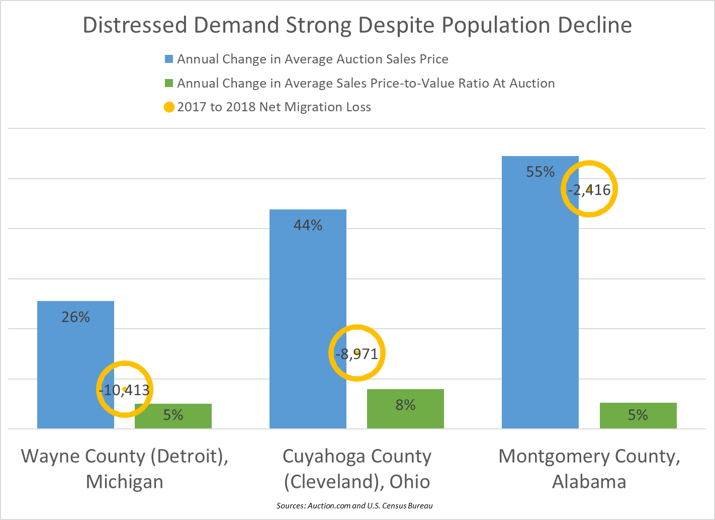 Real estate investors chasing good deals are helping to bolster distressed home sales even in some markets that lost population due to migration in 2018.