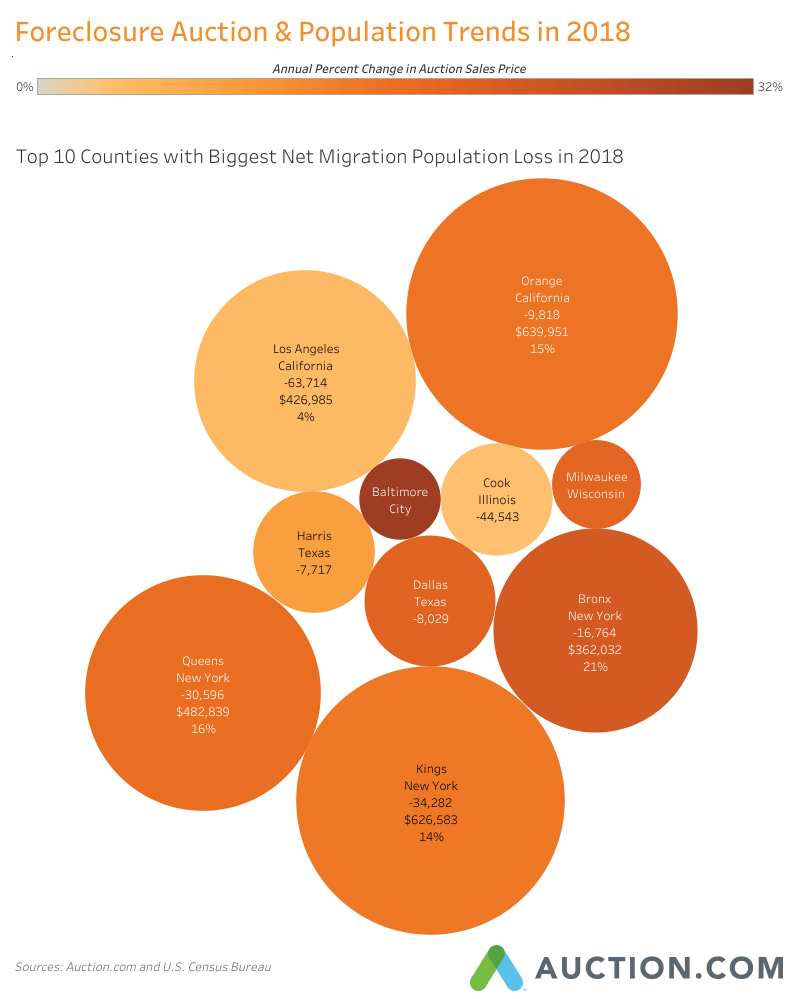 The Census data tracks population changes from 2017 to 2018, most pertinently changes caused by migration into or out of each county. The Auction.com analysis compared that net migration data to completed sales of nearly 65,000 properties at foreclosure auction in 2017 and 2018.